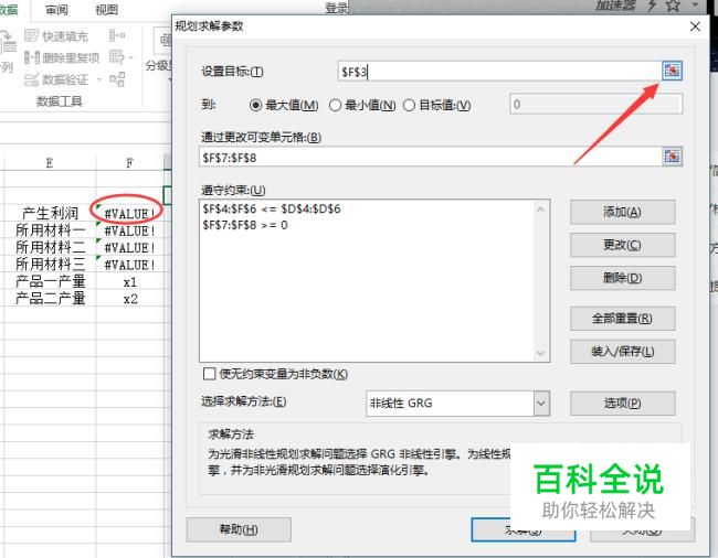 然后点击窗口中的“最大值”,再将“可变单元格”选中为产品一和产品二产量的两个单元格,如图所示。