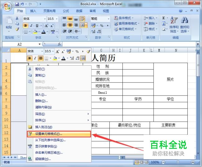 首先打开Excel2007软件,我现在打开的这一份简历的表格,是已经把相关的横排文字输入好了,接下来要在左侧边上的单元格里输入竖式文字。