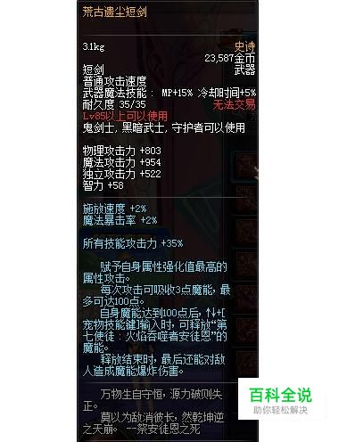 荒木遗尘短剑:伤害提升最大,缺点的是有10s魔能冷却时间,可以升级,升级以后的属性是70技能提升,无cd魔能,物理攻击力+803、魔法攻击力+954、独立攻击力+522、智力+52。