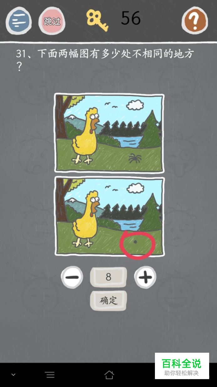 第三十一关:蜘蛛不同,一般都以为蜘蛛是个整体,但是这毕竟是坑人游戏,所以就是八条腿不同,选8就对了。