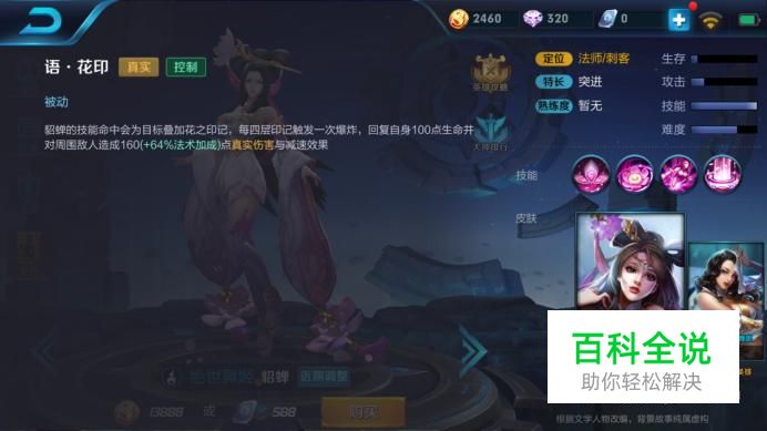 语,花印 貂蝉的技能命中会为目标叠加花之印记,每四层印记触发一次爆炸,回复自身100点生命并对周围敌人造成160(+64%法术加成)点真实伤害与减速效果。