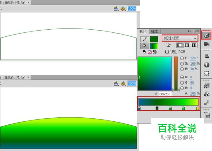新建一个Flash文件,执行【文件】/【保存】命令,弹出【另存为】对话框,输入名称为“睡觉的小鸡”,单击【保存】按钮,再选择【工具】面板中的【钢笔工具】,在图层1中绘制大地,单击【颜料】面板,设置如图所示,在工具箱中选择【颜料桶工具】,在绘制的图像内从上至下填充颜料,如图。