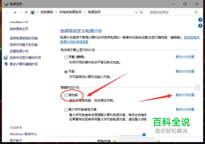 将“电池指示器上显示的计划”选择为“高性能”,然后再单击右方的“更改计划设置”。