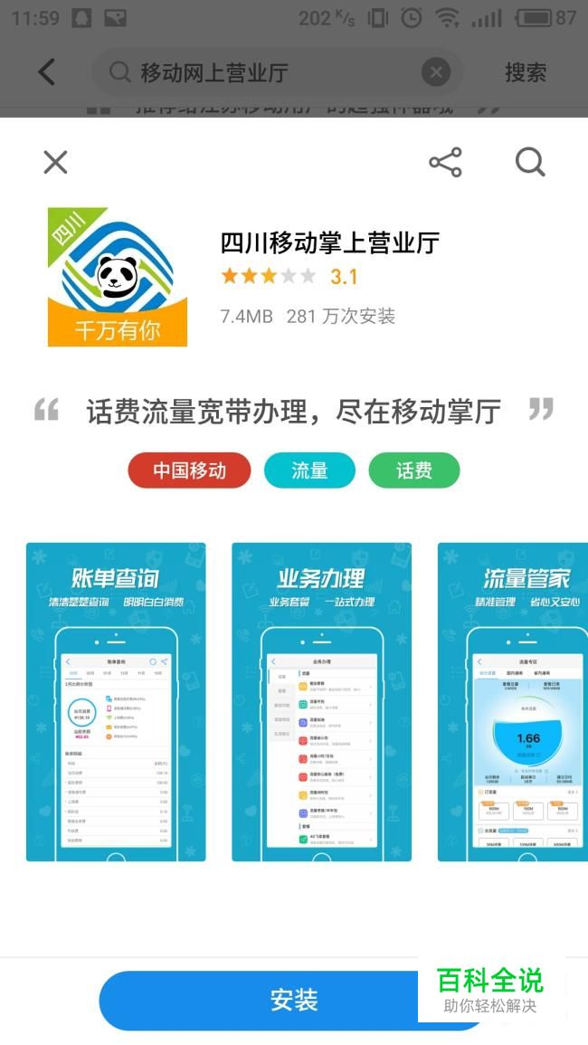在手机应用商店搜索下载安装当地的“移动掌上营业厅”
