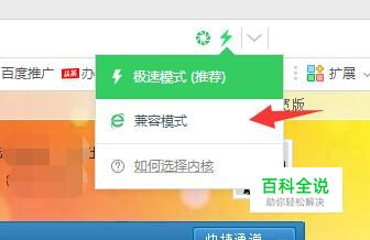 打开百度浏览器,找到网址栏旁边“闪电”点击就可以切换成兼容模式了