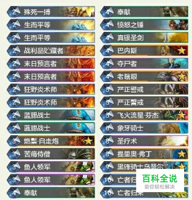巴内斯,用来增加我们的鱼人数量,掉出个领军或者老瞎眼对最后的斩杀都提供了很好的燃料,掉出个佛丁更是在前期就能获得一把53大刀,不过要注意牧师,以免刀被别人拿走了。