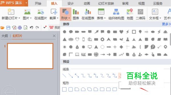 打开WPS演示,新建一个空白文档。在文档中,点击“插入--形状--曲线”。