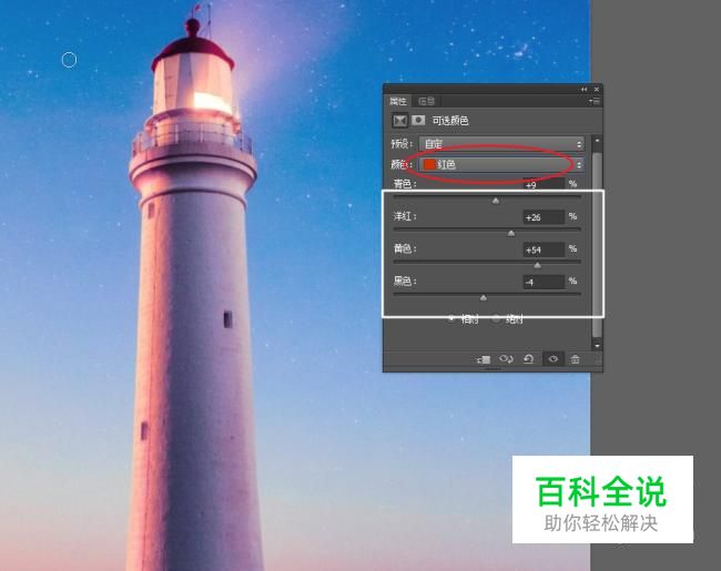 我们接着调整画面上的红色,我们将可选颜色的颜色改为红色。适当调整参数,尽量降低塔顶的红色~
