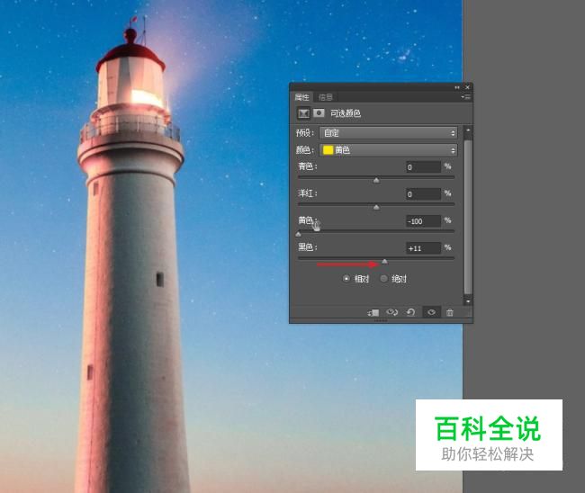 我们将黄色降到-100,这样我们可以看到黄色偏向了洋红色。