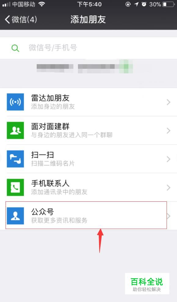 打开手机微信,进入到添加朋友界面,点击“公众号”进入