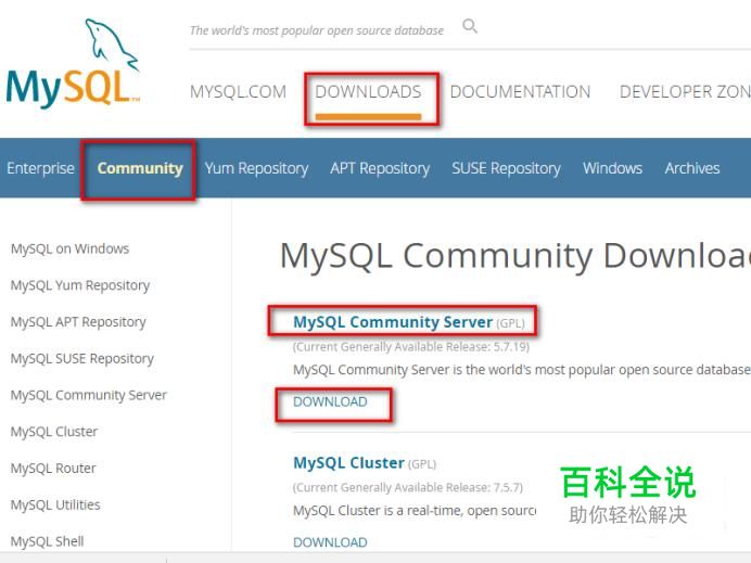 搜狗搜索MySql官网并打开官网页面,由于MySQL软件采用了双授权政策,因此产品分为社区版和商业版,我们在首页点击DOWNLOADS后,选择社区版(Community),然后点击MySQL Community Server下的DOWNLOAD按钮。
