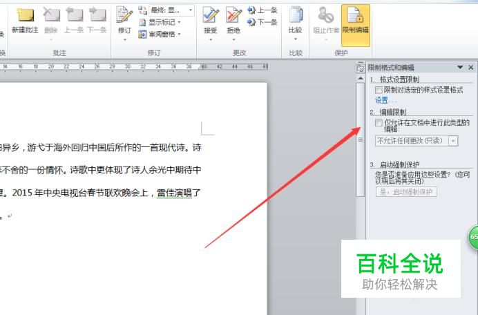 我们先把它设置成“只读”模式,再取消“只读”模式,这样就方便操作了,“审阅”—“限制编辑”,此时在文档右边会出现长方形的方框,如图所示