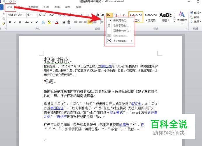 开始选项卡中,存在着一个常用功能组,那就是中文版式;包含:纵横混排、合并字符、双行合一、调整宽度、字符缩放;其中合并字符和双行合一较为常用,尤其是双行合一,在提示性文本上使用,会使排版更有活力;