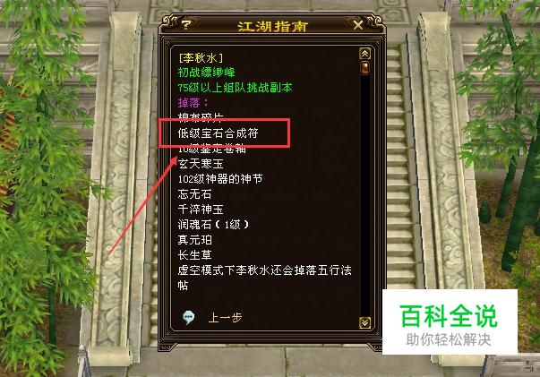 只要玩家达到75级以上。此时就可以在楼兰通过组队的方式进入到挑战缥缈峰的副本中,最后只要成功击杀BOSS李秋水就有一定的几率获得低级宝石合成符。