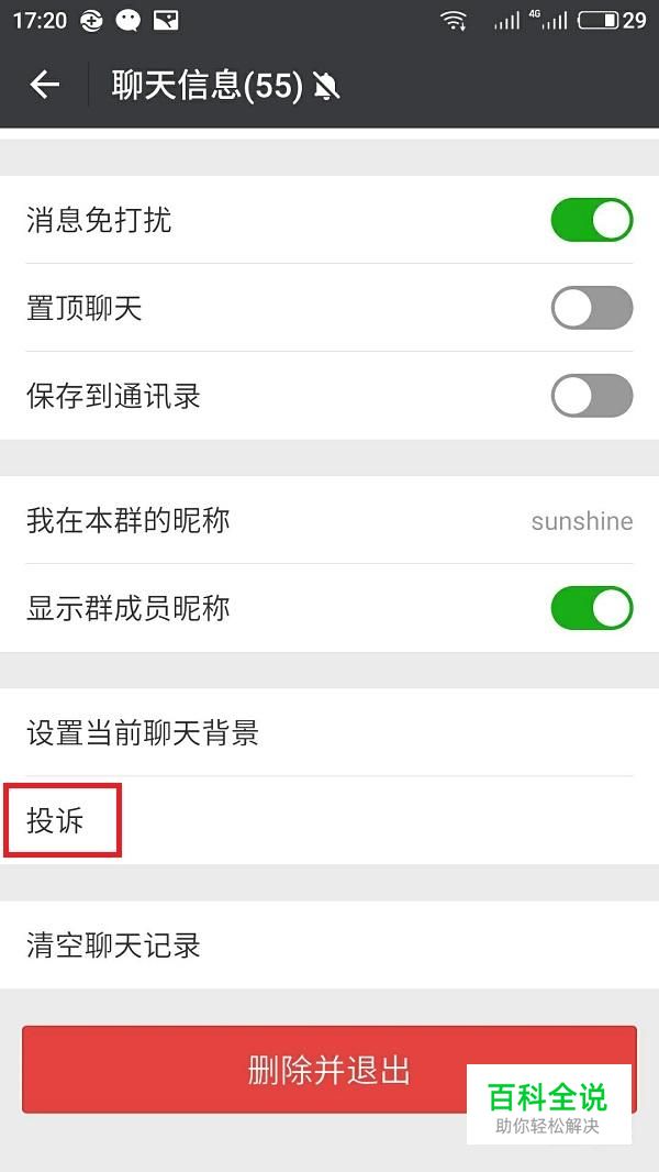 在“聊天信息”里一直向下翻,点击“投诉”选项。