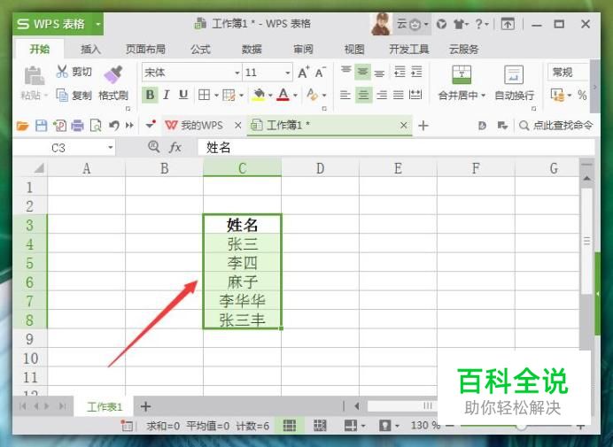 进入表格主界面后,制作一个简单的工作表。我们的目的是找到以“张”开头的单元格数据。首先框选出需要筛选的区域,如图所示: