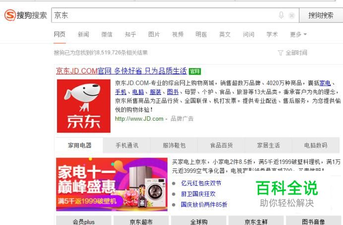 在搜狗搜索当中,输入关键词“京东”,搜索结果页面点开第一个网站