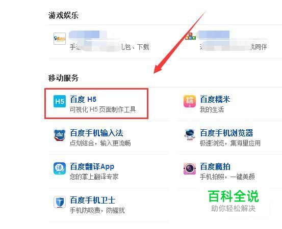 打开并登陆百度帐号,再进入百度产品页面中,在页面中找到并点击“百度H5”按钮,点击它进行下一页面的设置。