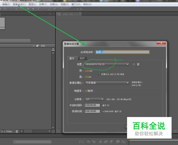 打开我们的AE软件,执行图像合成--新建合成组快速新建一个新的合成组。 将我们的合成预置设为:HDV/HDTV 720 25,持续时间设为10秒。 持续时间属性上输入:1000,按回车确定即可。