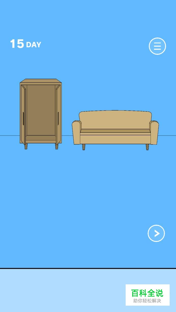 第十五关:来到第一个房间,我们会看到衣柜里空空如也,因此我们先要点击箭头,前往第二个房间打开抽屉,将手电筒收入物品栏,然后点击墙上的电灯开关,等房间变暗后,回到第一个房间拖动手电筒,就可以看到沙发右下角的游戏机了。