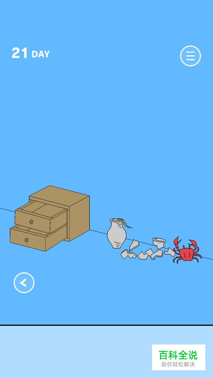 第二十一关:我们可以看到游戏机就藏在第一个房间内的沙发后方,但是游戏机上连着一根钓鱼线,因此我们要打开衣柜拿到箭头,将箭头拖到右下角并点击它,来到第二个房间后打碎右边的罐子,将一只螃蟹收入物品栏,最后再回到第一个房间,利用螃蟹剪掉钓鱼线,就可以拿到游戏机了。