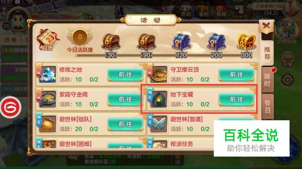 目前玩家可以在地下宝藏这个副本中获得初级升级符。首先打开活动界面,然后找到地下宝藏这个活动后点击“前往”按键。