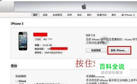 重新刷机 1.将iphone手机通过数据线与电脑相连 2.在电脑上打开软件iTunes界面 3.在按住Shift键的同时点击“恢复iphone”按钮。