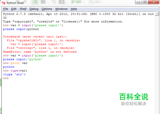 input('please input:')之后会返回一个值,可以用tpye()查看他的类型,然而当我们输入字符串或者字符的时候, 要用双引号或者单引号包起来不然就会报错