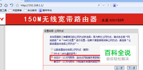 根据设置向导一步一步设置,选择上网方式,广电宽带不用的是要选择“动态IP(以太网宽带,自动从网络服务商获取IP地址)”这点与其他运营商不同。然后点击下一步