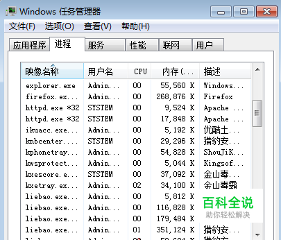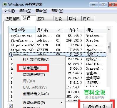 如果是控制面板无法响应,可以在任务管理器中结束无法响应的进程,选中需要关闭的进程,点击关闭进程或者右键选择也可以,如图。释放计算机内存也可以用一些软件,比如金山毒霸加速或360加速。或者重启计算机。