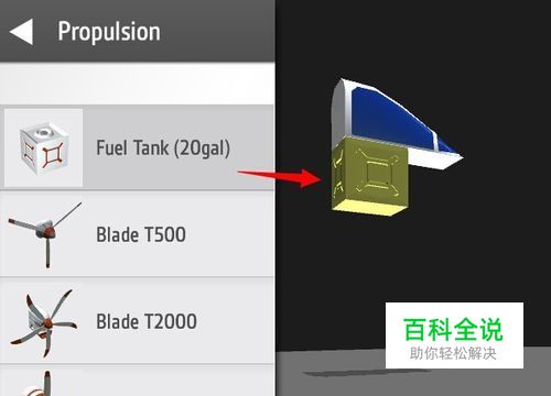 添加油箱 我们这一架飞机是全油箱架构,也就是说,整架飞机通过油箱来连接。首先,点击屏幕右上角的“加号”按键,在屏幕左侧弹出来的菜单中选择“Propulsion”(动力)分类,在“Propulsion”(动力)分类中,拖动“Fuel Tank”(油箱)组件到飞机底部原先两个方块的位置。