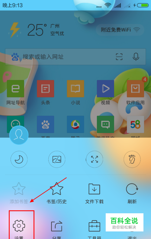 打开手机浏览器首页,一下以手机QQ浏览器为例。打开浏览器里面的功能区并且找到里面的设置功能。