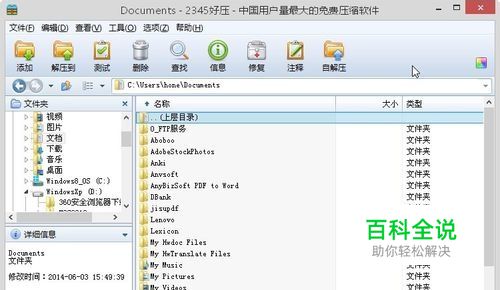 注意,以上2-4步的操作,不能通过好压界面左边的文件夹树来定位文件并打开。那样的操作将导致调用Excel打开选择的文档,而不是使用好压将它当作压缩文件来打开。