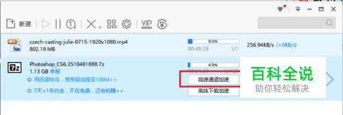 打开下载界面后,点击正在下载的资源。在下载进度下方,我们可以看到两种方法可以提升下载速度,高速通道加速和离线下载加速。高速通道加速,是使用电脑的剩余带宽进行加速,简单的地说,在你的宽带是1M的,正常下载速度是100k,饱和速度是200k,那么使用高速通道加速后电脑的所有带宽将投入到下载中,就是速度接近200k。