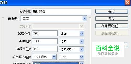 文件---新建 一张图 预设 选自定义 宽度 高度 分别设置 720 1280 像素 背景内容 选透明