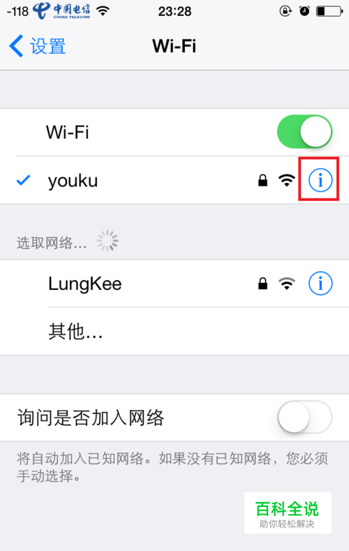 在手机打开无线网络设置找到连接的wifi,点击后面那个蓝色的感叹号