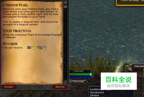 完成上述条件后,玩家即可钓起任务物品明亮的珍珠。根据提示带给达拉然卡德加。