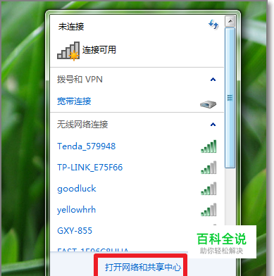 点击电脑右下角的无线信号标志,选择打开无线网络和共享中心