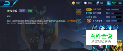 技能介绍 1,被动:兼爱非攻 连续的第四次普通攻击会将正前方的目标击退并造成125%法术加成及150%物理加成的法术伤害,释放所有技能都会获得短暂的护盾效果。 (平时对战时在准备攻击之前可以先普攻3下,这样真正攻击之时可以直接造成一次高额伤害。)