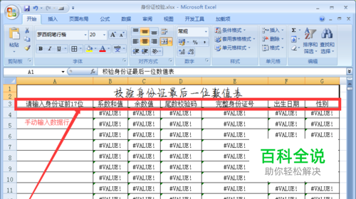 第八步:验证 在第一列输入身份证前17位,跳出后面的相关参数,查看是否符合逻辑。 (注:验证要使用已知的身份证号,抛去最后一位,输入验证),验证测试是人生一项程序运行之前的必须工作。如图: