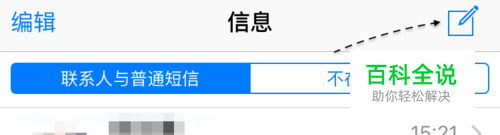 如下图所示,打开苹果手机上的信息应用后,点击右上角的【编写】按钮,创建一条新的短信。