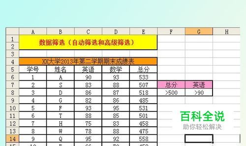 高级筛选的好处,快速直接的进行多组条件筛选。就假设要求快速找出总分>500分,而且英语成绩>90分的人。这次我们使用高级筛选方法。首先输入 条件选区,再进行高级筛选。