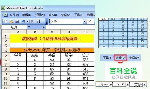 为了练习Excel自动筛选操作,我们举例如下图,数据越多越复杂,就越能体现自动筛选的重要。就假设要求快速找出 总分>500分,而且英语成绩>90分的人。框选数据(A5:E15),数据,筛选,自动筛选。