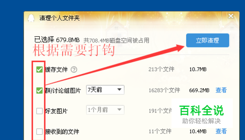 我们可根据自己的需要,来选择是否清理,例如我们想要清理缓存文件和群/讨论图片,就在前方打上勾,然后点击 ”立即清理“。