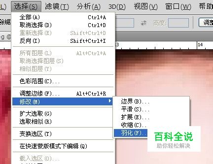 我们从菜单,选择-修改-羽化。弹出窗口,羽化5像素。
