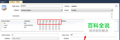 在设计表字段的时候,id列最后一个参数AI(Auto Increment)即为自增长,勾选上即可,需要注意的是必须定义成INT类型,并且必须设置成索引,在本例中将id设置为主键,默认为主键索引。