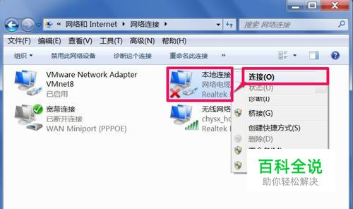 本地连接被禁用 第一步骤,查看一下本地连接有没有被禁用,如果被禁用了,重新启动连接一下,方法,打开桌面网络属性,进入网络连接窗口后,选择本地连接,右键,连接。