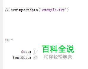 输入 ex=importdata('example.txt'),回车,出现以下结果 意思是此TXT中有4*3维的数据矩阵,一共有5*4维的元素矩阵。