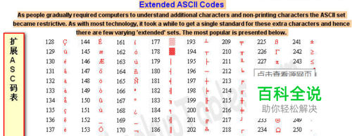 2)扩展 ASCII 码(Extended ASCII) 由于标准ASCII码字符集字符数目有限,在实际应用中往往无法满足要求。为此,国际 标准化组织又将ASCII码字符集扩充为8位代码及ASCII码的扩充。这样,ASCII码的字符 集可以扩充128个字符,也就是使用8位扩展ASCII码能为256个字符提供编码^这些扩充 字符的编码均为高位为1的8位代码(即十进制数128〜255 ),称为扩展ASCII码。扩展 ASCII码所增加的字符包括加框文字、圆圈和其他图形符号。