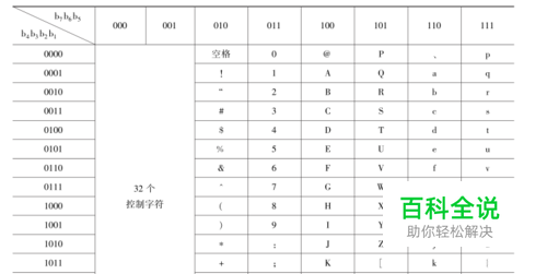 1) ASCII 码 目前计算机中使用最广泛的字符编码是ASCII码,即美国标准信息交换码(American Standard Code for Information Interchange)。ASCII 包括 32 个通用控制字符、丨0 个十进制数 码、52个英文大小写字母和34个专用符号,共128个元素,用7位二进制数进行编码。通 常使用一个字节(即8个二进制位)表示一个ASCII码字符,规定其最高位总是0。表1-3 为ASCII码编码表。